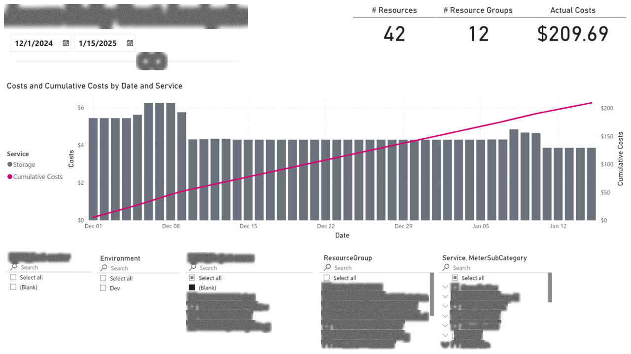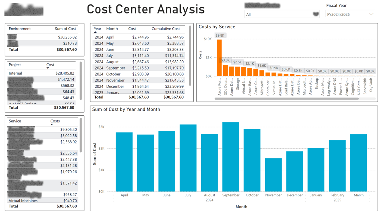 I built a FinOps report that maps every line item to a cost center and project via Azure resource tags, then exposes the data at four levels of granularity: daily, monthly, fiscal-year, and YTD trends. A tag explorer page lets ops leads see what's untagged (and therefore unallocated), and a meter-category page shows which Azure services are driving cost growth versus steady-state.