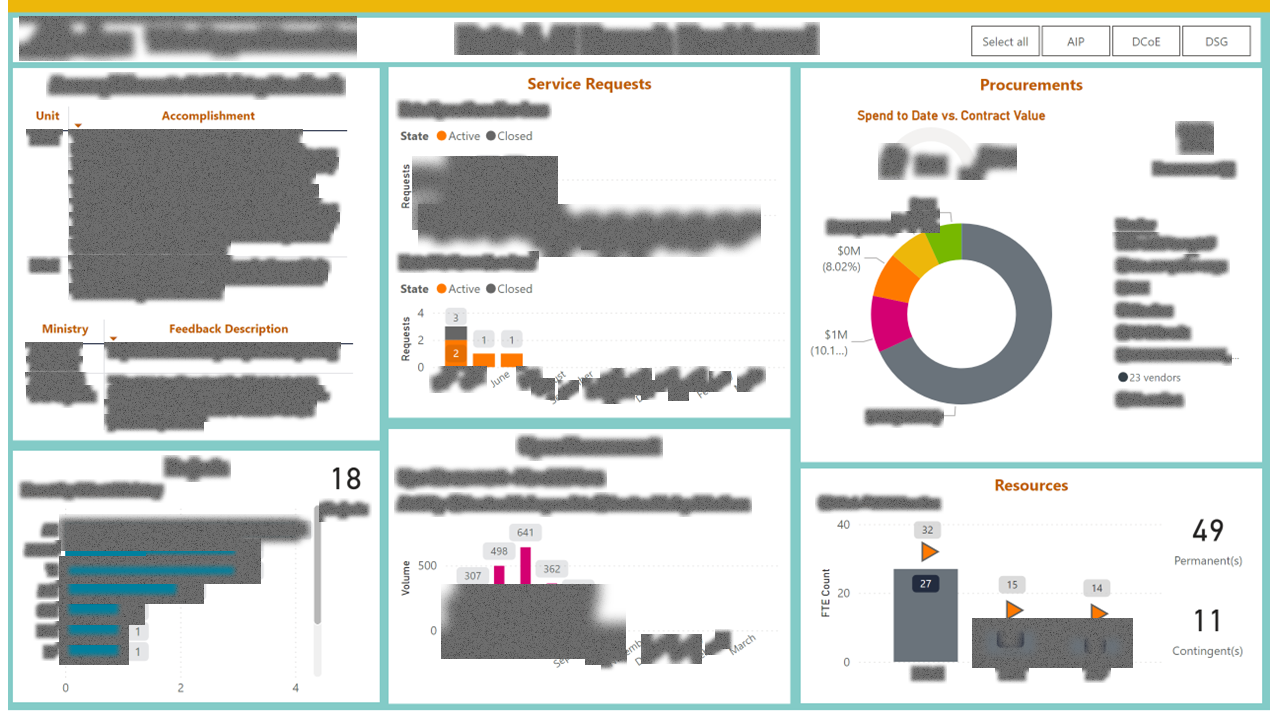 I designed a multi-page report with one page per functional domain (resources, recruitment, operations, projects, services, procurement, stakeholders) and a top-level infographic overview that pulled the most important metric from each. Cross-filtering lets a reader click a project on the operations page and see the headcount, services, and procurement linked to it. Each page is owned by the relevant lead but rolls up automatically into the overview.